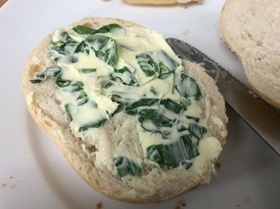 Bärlauchbutter: Butter eine Weile bei Zimmertemperatur erweichen lassen, dann mit kleingeschnittenen Bärlauchblättern vermischen, nach Geschmack Salz zufügen.