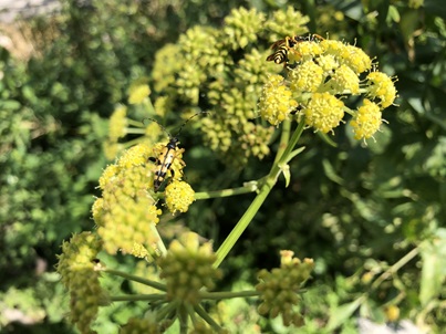 Blütenstand des Liebstöckels mit Geflecktem Schmalbock und Wespe