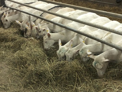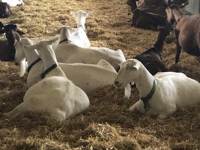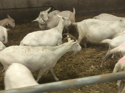 Behornte Saanenziege unter enthornten Saanenziegen