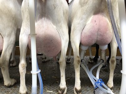 Gämsfarbige Bergziege und Saanenziege an der Melkmaschine