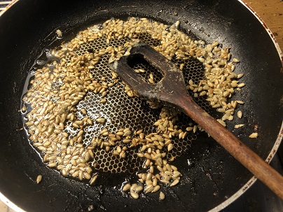 In der Pfanne werden Sonnenblumenkerne geröstet